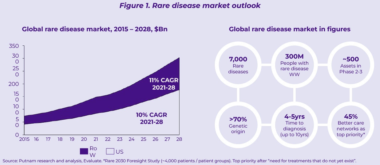 Over the last decade, rare diseases have represented an increasingly popular growth avenue to offset the challenges faced in other mature franchises. The boards of several mid-sized pharma companies have pivoted their increasingly commoditized portfolios towards rare diseases attracted by compelling returns on investment (especially in the US) and the ambition to play an active role in the biopharma innovation ecosystem. As a result, the rare disease market has exhibited remarkable growth over the last 6 years – doubling in size between 2015 and 2021 – and promises to maintain double digit growth through 2028 (11% CAGR between 2021 and 2028, Figure 1). With nearly 500 assets in phase 2-3 development (Figure 1), this field is set to continue growing well beyond 2028, further fueled by advances in precision medicine.