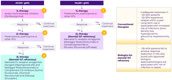 Inhibitors of acetylcholinesterase (AChE) are effective to some degree in nearly all subgroups of MG, however, nearly all MG patients will require immunosuppressive therapy to achieve maximum therapeutic benefit. Corticosteriods in combination with azathioprine (or other ISTs) are used for first line immunosuppression. Patients not responding to initial immunosupression therapies are managed with biologics. While there are multiple approved biologics for AChR+ patients, there is only one approved therapy (RYSTIGGO) for MuSK+ patients.