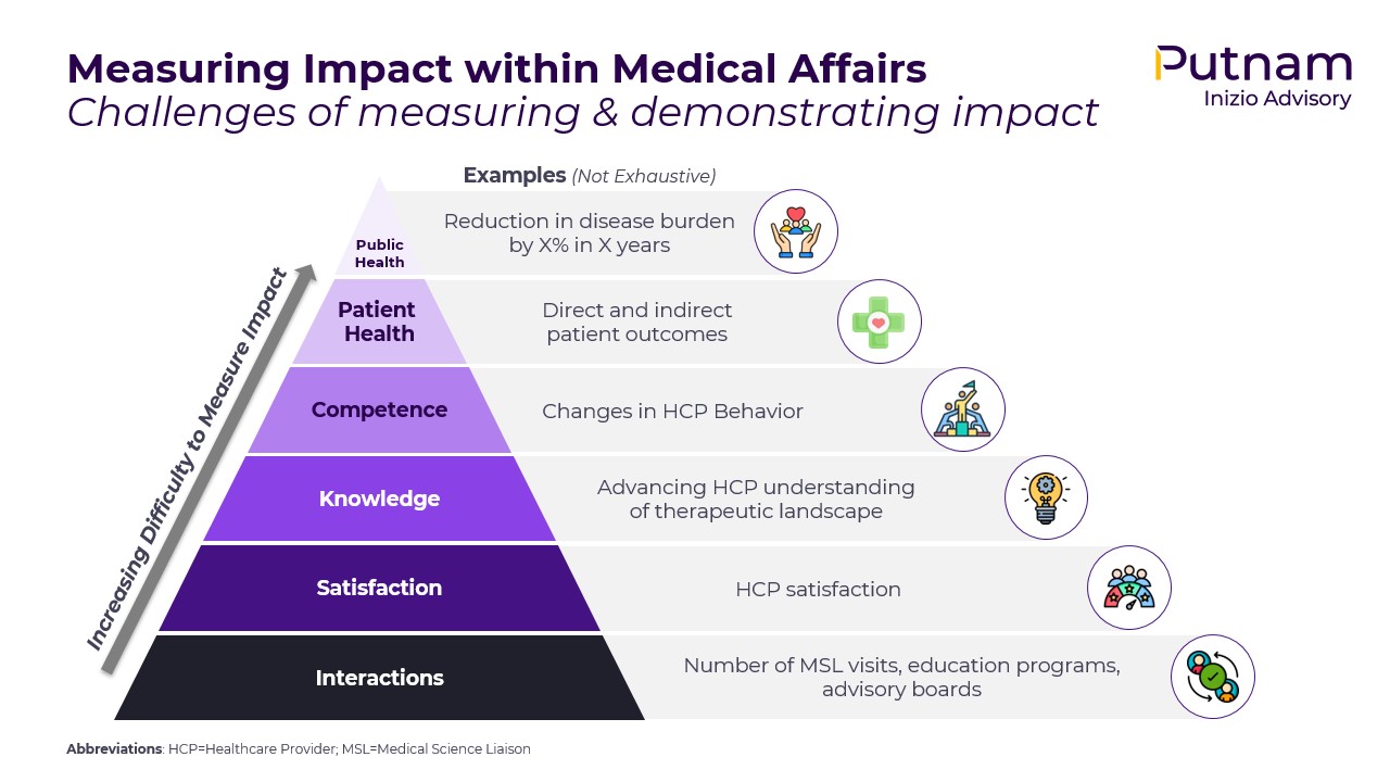 Measuring and titrating Medical Affairs strategy against tangible metrics was a focus of multiple compelling sessions at the summit. The optimal mix of metrics should measure not just ‘activity’ (e.g., HCP interactions), but also ‘impact’ (i.e., how Medical Affairs activities impact the behavior, knowledge, and beliefs of healthcare stakeholders to drive better patient outcomes). Metrics should be reflective and suggestive of specific elements of (and required adjustments to) Medical Affairs strategy and tactics, e.g., change in behavior across diagnostic or therapeutic pathways, or awareness of a specific MoA element. Ultimately, presenters converged on a common theme that should guide the mission and choice of metrics: improvement of patient and public health, and the reduction of disease burden (Figure 1).
