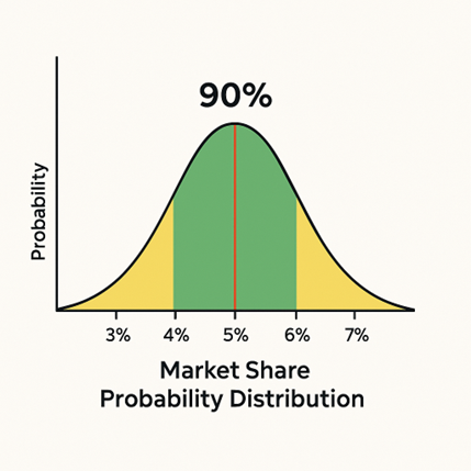 For instance, instead of saying “Product X will capture 5% market share”, we can run simulations that quantify the likelihood of hitting exactly 5%, as well as showing that there’s a 90% probability your share will land between 4% and 6% – and a 0% chance of falling outside 3% to 7%.This probability distribution gives clients a much more realistic and resilient foundation for strategic decisions.