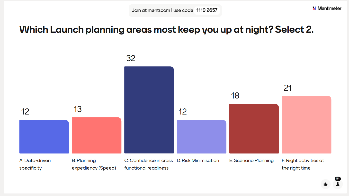 When we surveyed delegates, 54 respondents indicated the biggest launch planning area keeping them up at night is “confidence in cross-functional readiness” (30%). See Figure 1. The data showed the following areas are also top of mind and a priority to solve for; data-driven specificity, planning expediency (speed), risk minimisation, scenario planning and executing the right activities at the right time.