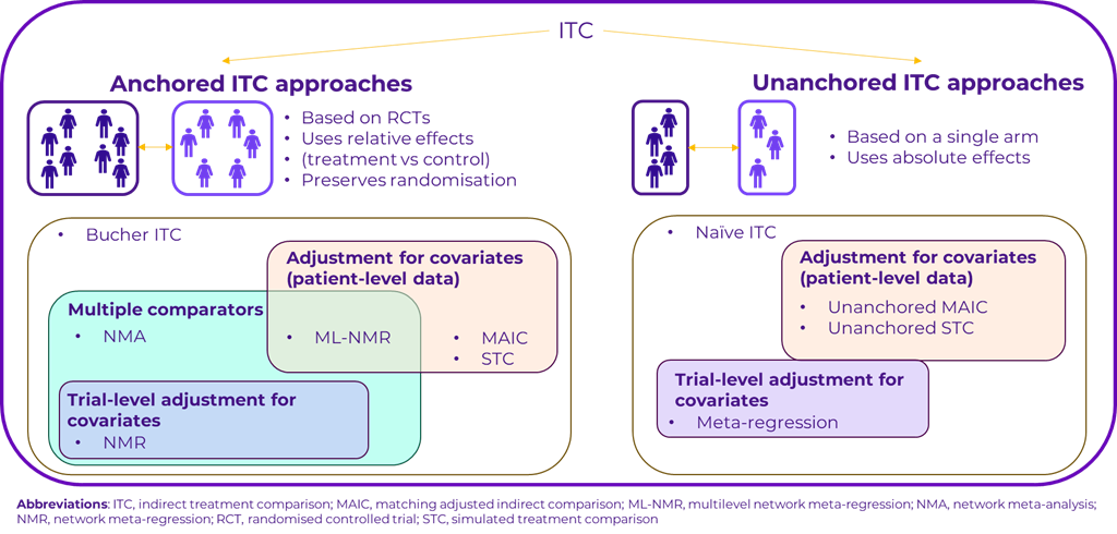 A core decision in any ITC is whether to use an anchored or unanchored approach. Anchored ITCs rely on randomised controlled trials and use a common control group to compare treatments. This method is preferred for its ability to preserve the integrity of randomisation, thereby minimising bias. Anchored approaches include methods like network meta-analysis, network meta-regression, matching adjusted indirect comparisons (MAIC), and multilevel network meta-regression (ML-NMR). MAIC and ML‑NMR adjust for patient-level covariates, providing a more refined and accurate estimate of the treatment effect.