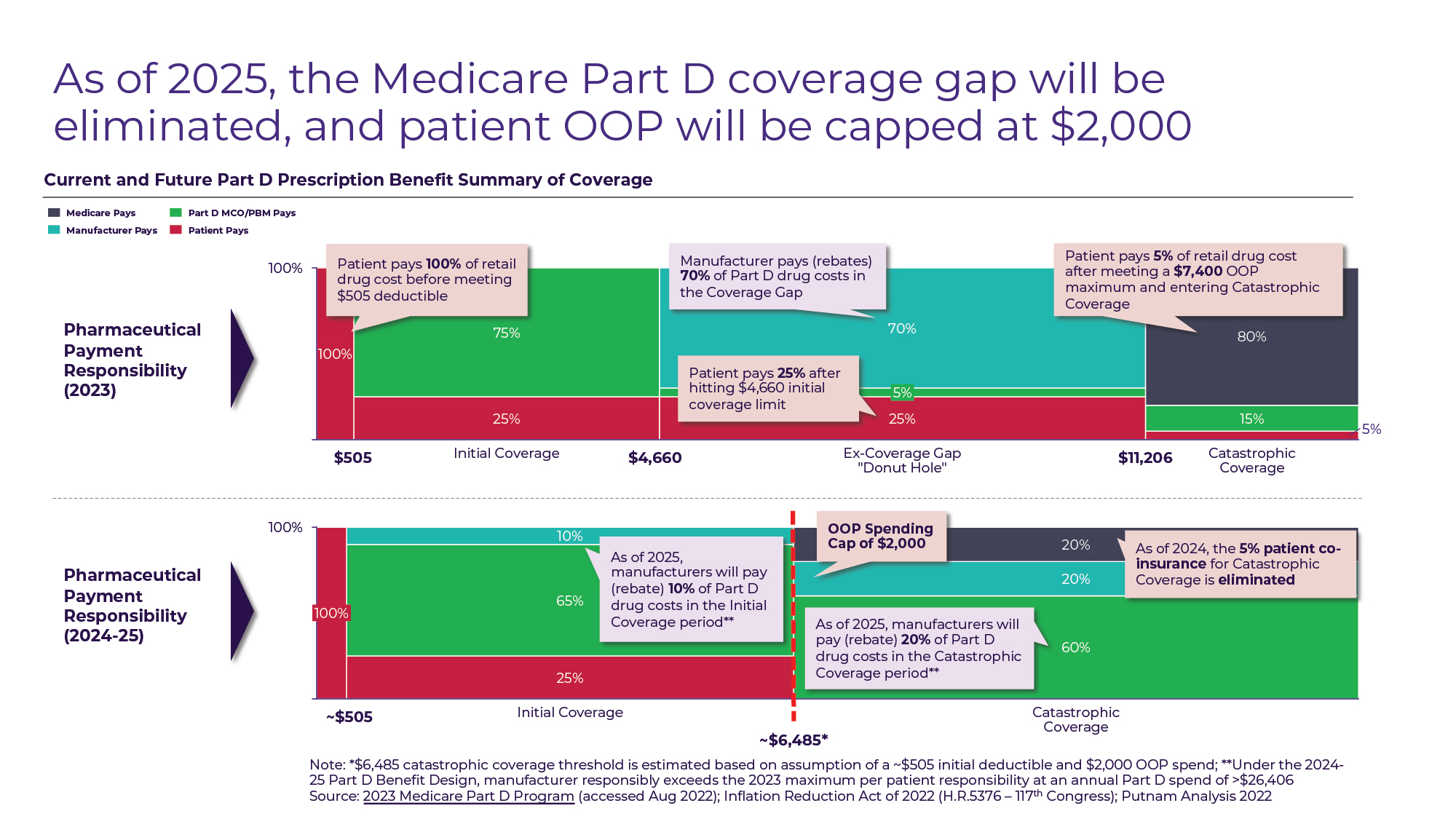 • Patient out-of-pocket (OOP) spending limits (2023-2025): Currently, there is no out-of-pocket cost ceiling for Medicare Part D beneficiaries, with the patient responsibly progressively declining from 100% until the $505 deductible is met, to 25% during the initial coverage and coverage gap period, to 5% once patients reach the catastrophic coverage limit (out-of-pocket spend exceeding $7,050 for 2022). The Act includes a series of provisions designed to reduce out-of-pocket spending for Medicare Part D enrollees in 3 phases. In 2023, patient cost-sharing will be eliminated for all vaccines covered under Medicare Part D – creating parity with vaccines covered under Part B like pneumococcal and influenza – and patient cost-sharing for insulin will be capped at $35 for a one-month supply. In 2024, the 5% coinsurance for Part D beneficiaries who reach catastrophic coverage based on out-of-pocket drug spend will be eliminated. One year later, an annual Part D out-of-pocket maximum of $2,000 will take effect.